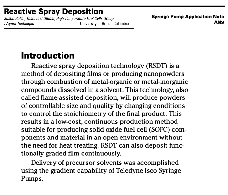 Reactive spray deposition technology (RSDT) is a method of depositing films or producing nanopowders through combustion of metal-organic or metal-inorganic compounds dissolved in a solvent.