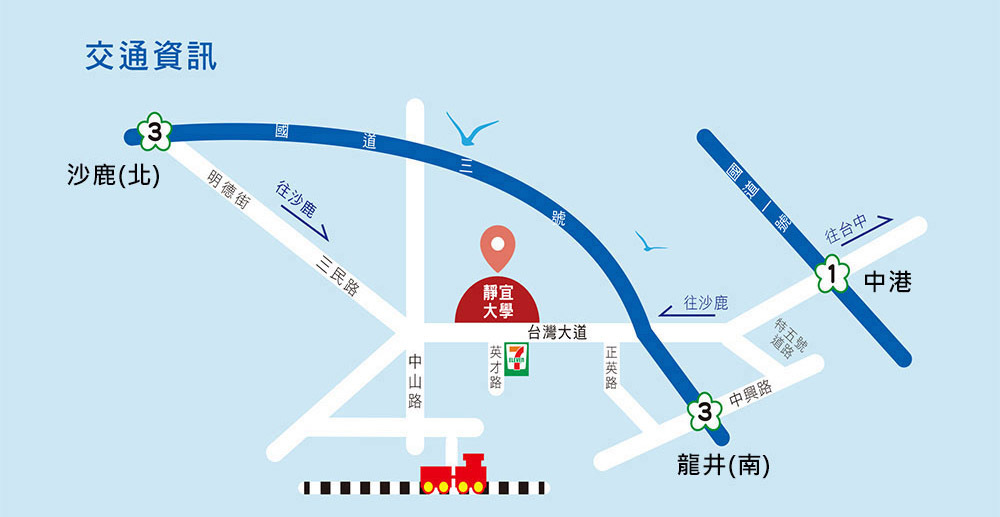 - 龍井交流道:自國道三號國道三號 → 請下 182.8 km 龍井交流道 (龍井/台中) → 請選擇台中方向出口 → 第一個紅 綠燈 (約 700 公尺) 左轉 → 往省道 12 沙鹿方向行駛 → 至臺灣大道左轉 → 約 4 公里即可抵達本校