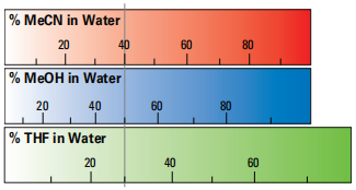 圖 1 的列線圖列出了反相中常用的各種有機溶劑的等效濃度。透過使用垂直線連接目前溶劑濃度與新溶劑的濃度來讀取新溶劑的濃度。 40% 乙腈 (MeCN) 的溶劑可以替換為 50% 甲醇 (MeOH) 或 30% 四氫呋喃 (THF),以獲得相同的純化效果。實際上,根據化合物的不同,這可能會有所 ± 5% 的變化,但使用列線圖將提供一個接近的起點。