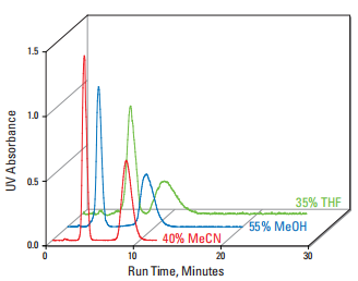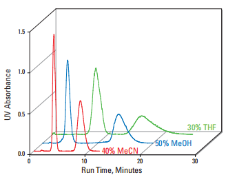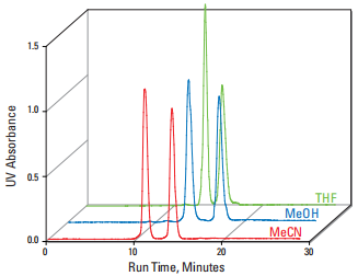由於溶劑與不同化合物類別之間的選擇性差異,很難使在不同溶劑中運行的色譜圖完荃匹配。改變沖提溶劑可以利用來調整洗脫化合物之間的間距。在這個範例中,四氫呋喃 (THF) 與甲醇和乙腈相比顯示出顯著差異。