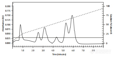 在建立新方法時,通常建議創建一個從 0 – 95% B 溶劑的非常緩慢的梯度,以確保所有峰值都被洗脫並且柱子被清潔。