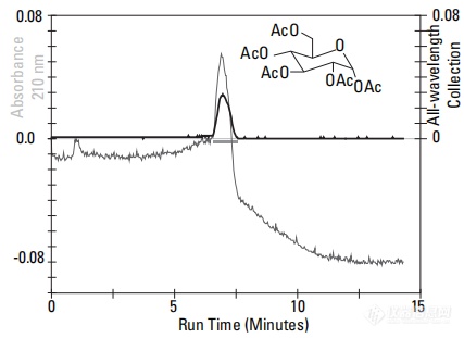 葡萄糖五乙酸酯在 210 nm 波長的吸光能力較弱,在圖譜上其吸收更進一步被二氯甲烷影響,因二氯甲烷也會吸收 210 波長(參見 圖 4)。當二氯甲烷的濃度降低時,基線會向下漂移。這種漂移通常會幹擾傳統的分部收集程序,但在波段收集技術面前,這並不是問題。波段收集能夠有效地濾除基線漂移,從而為 CombiFlash 系統中的分部收集器提供一個穩定的基線。