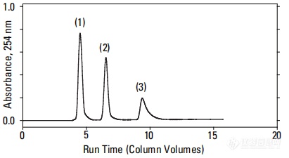 圖 6:單一波長技術可分辨出三種吸收 254 紫外光的化合物。而 圖 7 則展示了利用波段收集技術進行選擇性純化的過程,其中化合物 1 和 3 在 295 nm 至 325 nm 的波長範圍內有吸收而化合物 2 不吸收該波段波長。