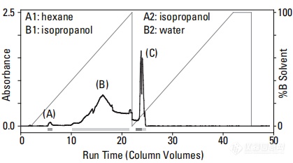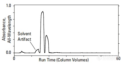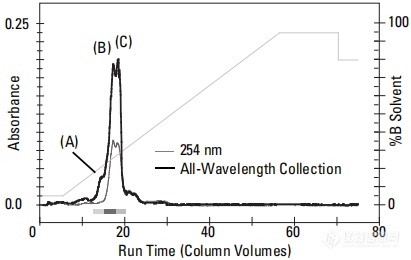 若選定波長範圍內溶劑無吸收,可將峰寬設為長八分鐘。此設定同樣適用於等度洗脫,因基線穩定,即使溶劑吸光度落在波段收集選定範圍內,仍適用此設定。圖 1 展示了以此技術純化的情況。