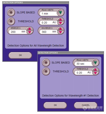波段收集技術的參數設定位於 CombiFlash 系統的方法編輯器介面。啟動波段收集功能後,便可配置偵測器的各項參數 (請參閱 圖 8)。可配置的參數包括波長範圍 (用於濾除溶劑或非目標化合物)、峰寬度、斜率、閾值。當波長範圍包含無吸光度的區域雖然會降低波段收集的靈敏度,但依舊能夠實現化合物的收集。