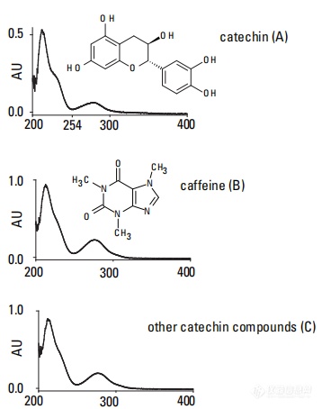 圖 2:使用波段收集技術檢測兒茶素 (A) 以及咖口非因 (B) 和其他兒茶素類化合物 (C)。