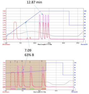 Teledyne Isco 發明的「聚焦梯度」與其他品牌製備色譜計算梯度的程序相比,聚焦梯度的生成非常簡單、易用,最新的 PeakTrak 軟件允許用戶使用任何分析高效液相色譜系統來運行偵察梯度。當使用 ACCQ Prep® HP150 的校準流程將系統駐留體積、柱體積和化合物洗脫時間的測量值合併到系統上,在使用 ISCO 的色譜柱情況下,校準僅需要 7 到 10 分鐘 [1]