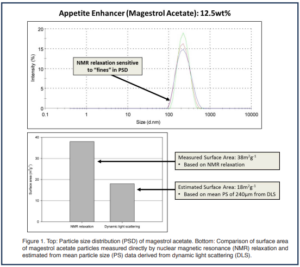 使用動態光散射測量的粒度分佈 (PSD) 被發現是均勻的,平均等效球徑為 240 nm。 假設粒子確實是球形的,這將計算出 18 m2 g-1 的表面積。 然而,通過 MagnoMeter 使用 NMR 弛豫直接測量的潤濕表面積被發現為 38 m2 g-1 (圖 1 底部)。 兩種測量技術之間表面積結果的差異出現是因為表面積與直徑的平方趨勢。 NMR 弛豫時間對任何 PSD 中的「細粒」更為敏感 (圖 1 頂部),因此,在此應用中,MagnoMeter 的測量優於動態光散射。 我們可以看到,核磁共振結果表明,略高於 100 nm (大約當前 PSD 的 D10) 的醋酸甲地孕酮粒徑將提供卓越的生物利用度。