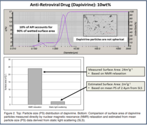使用靜態光散射裝置測得的平均粒徑為 2.4 µm,再次假設為球形,計算表面積為 2 m2 g-1。 然而,使用 NMR 弛豫測量的表面積相當大,為 24 m2 g-1 (圖 2 底部)。 通過檢查 PSD 數據可以很容易地解釋這種差異。 首先,顆粒的顯微照片清楚地表明應該拒絕球形假設 (圖 2 插圖)。 這突出了一個事實,即僅基於光散射技術的粒徑測量可能會產生誤導並導致錯誤的結論。 其次,我們可以看到懸浮液實際上是雙峰的 (圖 2 頂部),如果我們使用較小部分的粒徑,則表面積值是一致的。 這一發現很重要,因為它表明僅 10% 的 API 就佔了 90% 的表面積,因此也就佔了生物利用度、溶出度和細胞毒性。 這再次說明在存在大顆粒的情況下,使用光散射技術測量含有小顆粒或非常小顆粒的懸浮液的表面積的局限性。