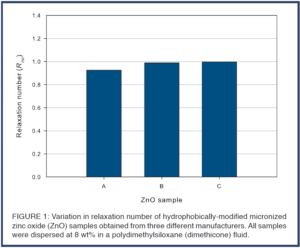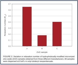 在第二個示例 (圖 2) 中十二烷基新戊酸辛酯測量重複性再次 < 1%。 然而,有機分散液的這種變化導致所有三種材料的潤濕效率都低得多,並且三種分散體各自的弛豫數存在很大差異。 這無疑是因為,儘管製造商聲稱,每個 ZnO 表面的「矽烷塗層」並不完全相同,因此任何不相容的有機流體的潤濕差異都是可以預料的。 從 圖 2 的結果可以看出,ZnO 樣品 A 的分散體具有最大的 Rno 值,因此是迄今為止最有效地被十二烷基新戊酸辛酯潤濕的分散體。