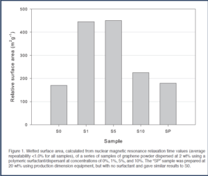 圖 1 顯示了石墨烯懸浮液的潤濕表面積,分散劑的 wt%:S0: 0%、S1: 1%、S5: 5% 和 S10: 10%;SP: 20 % 製備的分散體,但不含表面活性劑 (即與樣品 S0 相同)。 由於聚合材料的吸附會影響特定表面弛豫參數 kA 的值,因此此處計算的潤濕表面積值是相對值,而不是絕對值 (請參閱 Mageleka 白皮書 #1)。