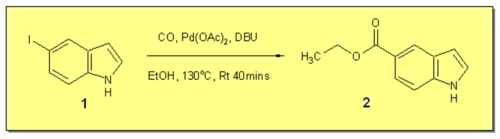 This example illustrates the use of the new Vapourtec tube in tube gas reactor combined with the Vapourtec R-Series system to react reagent gases under pressure without the use of scale limiting pressure reactors (e.g. Parr ‘bombs’). Here we describe the catalytic ethoxycarbonylation of unprotected Iodoindole with CO Gas