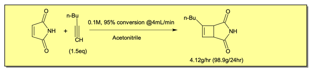 The [2+2] photocycloaddition of Maleimide and 1-Hexyne is a well established continuous photochemical reaction1. Due to the precise control of the irradiation time this transformation has been shown to be superior to the equivalent batch conditions when performing this problematic photochemical reaction on a larger scale.