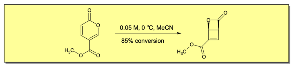 The photochemical transformation of methyl coumalate to the pyrone via electrocyclisation has been shown in the total synthesis of a range of Piperarborenines by Prof. Phil Baran’s group1,2. Baran et al performed the photochemical reaction under traditional batch conditions irradiating his reaction in a jacketed quartz immersion well with a pyrex filtered 450W mercury lamp. Studies carried out by Prof.