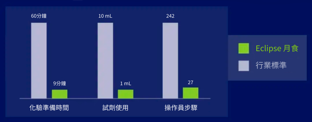 本系統透過最高減少 85% 的勞動量和 90% 的昂貴的鱟試劑使用量,大幅提高了實驗室的檢測效率。透過技術進步實現更高的精確度,並採用更少的步驟,Eclipse 平台減少了對操作員進行廣泛培訓的需要,且降低了重複性壓力損傷的風險,同時增加了用戶的單日化驗次數。