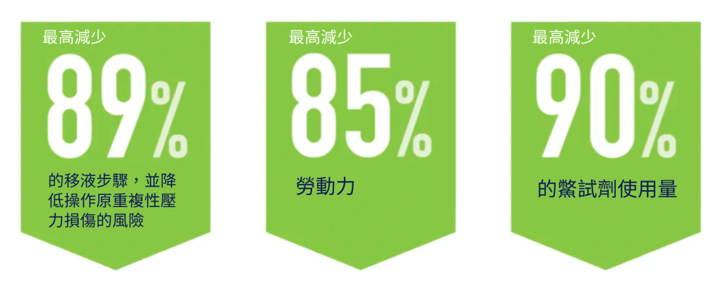 最高減少 89% 的移液步驟,並降低操作員重複性壓力損傷的風險