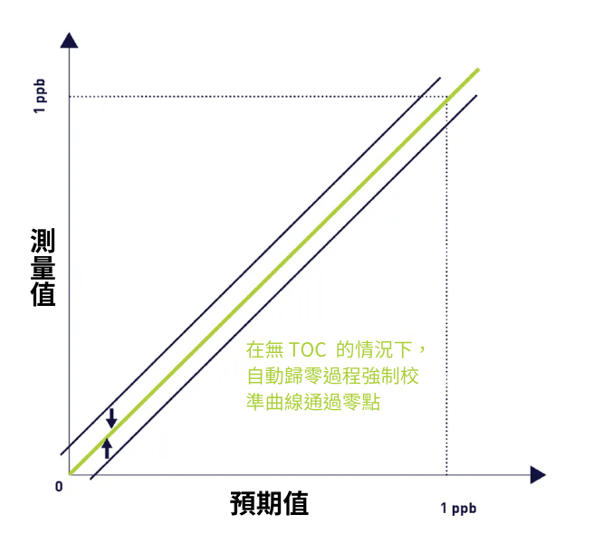 用於製備校準標樣的樣瓶,即便經過最嚴格的清潔,認證的 TOC 都僅低於 10 ppb,因此無法用於製備亞 ppb 校準標樣。此外,樣瓶和校準標樣的製備過程會為標樣帶來 TOC 誤差 (通常會增加幾個ppb 的 TOC),因此校準標樣僅在稱重誤差和測量誤差可以忽略不計的幾百 ppb 以上的範圍有效。當分析儀在校準點附近工作時,調整上述濃度 (如 1 ppm校準) 下的校準 (增益) 會對報告結果的準確性產生正面影響,但當分析儀在低於校準點幾個數量級的濃度 (接近零) 下工作時,調整校準就對報告結果的影響非常小。