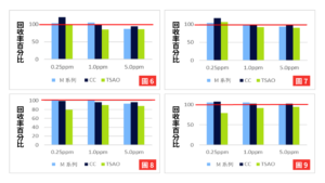 圖 6 – 圖9 顯示了在本次研究中評估的 4 種化合物的回收率。各圖中的紅線代表 100% 回收率。