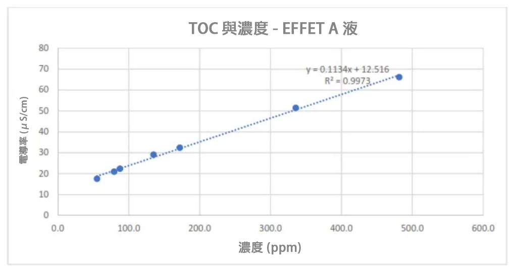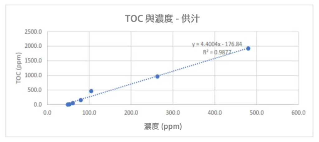 研究結果顯示,無論對何種污染物,TOC 測量都能隨加標濃度變化而表現出高度的線性。相關性斜率表明,TOC 測量在整個加標濃度範圍內具有高度的敏感性。
