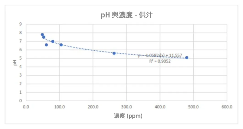 我們同樣無法看到冷凝水的 pH 值與污染物的加標濃度之間的線性相關性。 pH 值的實測結果只能被繪成對數函數,這表示用 pH 值來檢測冷凝水中的有機污染物的敏感度和實用性皆都不足。