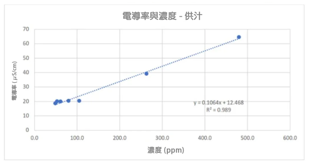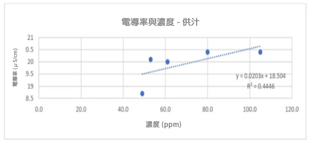 圖 6:當供汁的加標濃度較低時電導率相關性的線性較差