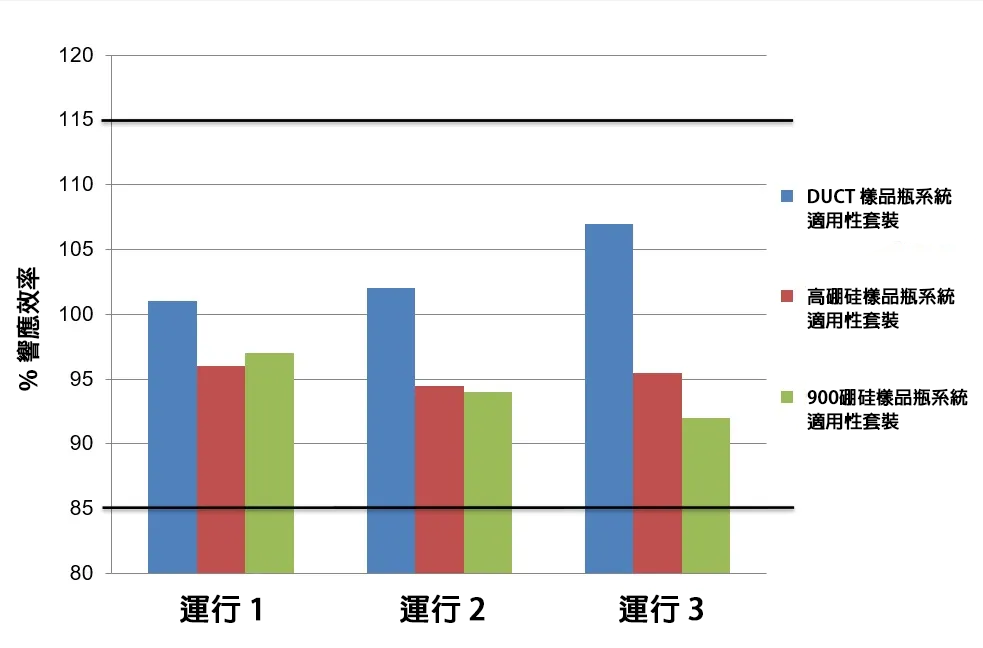 三組系統適用性套裝都符合使用 Sievers M9 實驗室型分析儀時的 85 – 115% 合格標準。響應效率百分比顯示了同時使用 Sievers M9 實驗室型分析儀和 DUCT 樣品瓶的適用性和可接受性。請參閱圖 1 的數據。