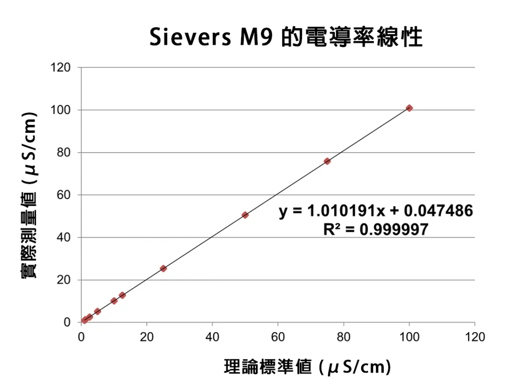 M9 分析儀電導池的性能達到並超過 USP <645> 規定的所有的儀器規格和操作參數。 M9 分析儀透過同時檢測非溫度補償樣品電導率和溫度,來檢測階段 1 電導率。 M9 分析儀也提供美國藥典 (USP)、歐洲藥典 (EP)、中國藥典 (CP)、印度藥典 (IP) 的接受標準的清單。有關 M9 分析儀電導池的準確度、精確度、範圍、線性等規格,請參閱 表 1圖 3。⁷