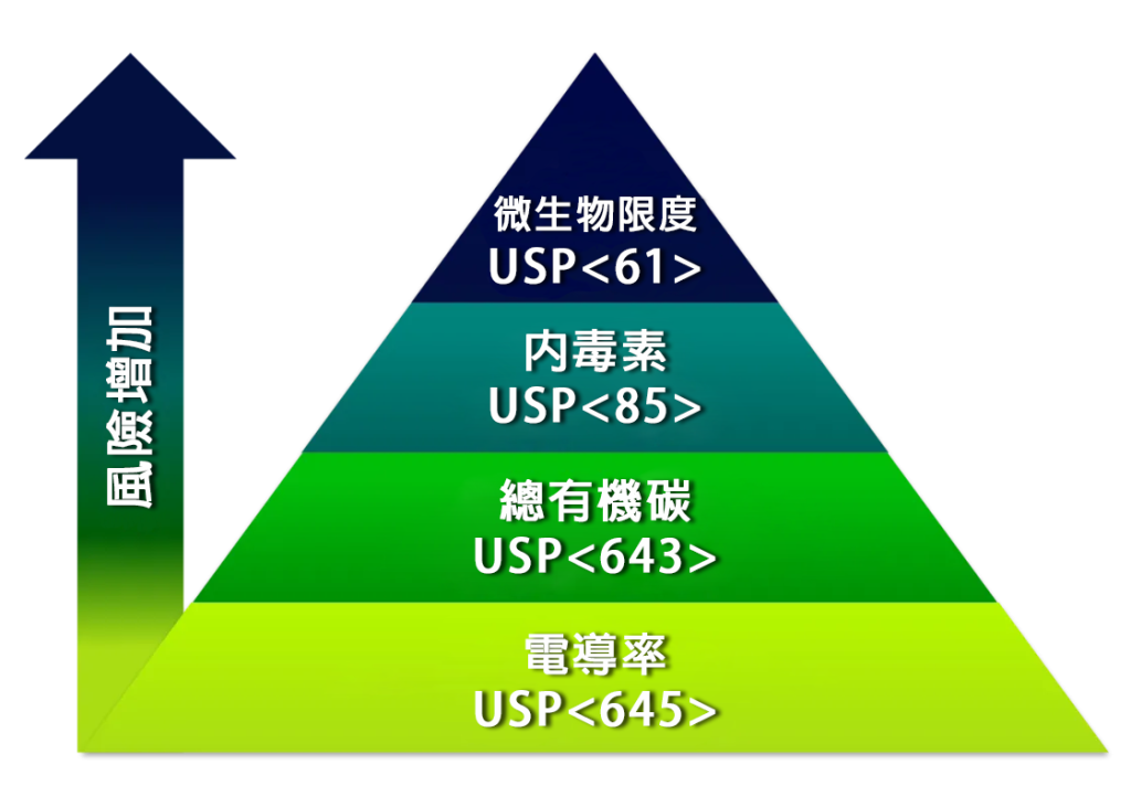 USP 和 NF 要求檢測四種製藥用水,分別為超純水 (UPW)、注射用水 (WFI)、血液透析用水、純蒸氣水2。檢測這四種水時,要求檢測電導率、總有機碳 (TOC,Total Organic Carbon)、內毒素、微生物極限 (見圖 1),目的是為了確保產品的可靠性、有效性、安全性。如果檢測結果達不到規則要求,就會產生各種後果,輕則被迫召回產品,重則危及病患的生命安全。因此企業高度重視和密切關注能夠幫助達標的分析方法。