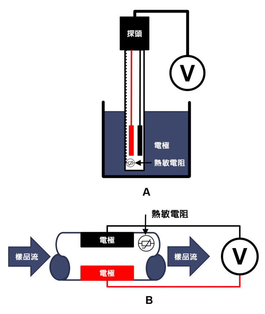 在偵測電導率時,使用探針或讓水流穿過電導池,偵測已知電位差上的電流。電導率探針或電導池在已知電位差上使用兩個或更多已知尺寸的電極。直接偵測電流,然後計算電導。電導率是基於池常數的歸一化電導值,而池常數取決於池尺寸。