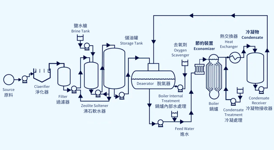 鍋爐系統是一個半封閉的循環系統,它的工作原理是先將水加熱使其轉換為水蒸氣後驅動發電機發電,同時蒸汽冷凝結成水後繼續回到系統循環使用。因此鍋爐水的化學組成直接影響了鍋爐效率和燃料的消耗。不合理的水處理容易使鍋爐產生結垢並對鍋爐系統產生腐蝕。水中的雜質在高溫的鍋爐管壁上很容易產生結垢和沈積物。結垢會隔離鍋爐管,降低鍋爐加熱效率,在產生同等蒸氣的情況下耗費更多燃料。例如,一個中度結垢的 250 HP 鍋爐相比一個「潔淨」的鍋爐,在產能相同時,每年要多消耗數千美元的燃料。而且腐蝕會降低設備的使用壽命,並需要更多的維修費用。