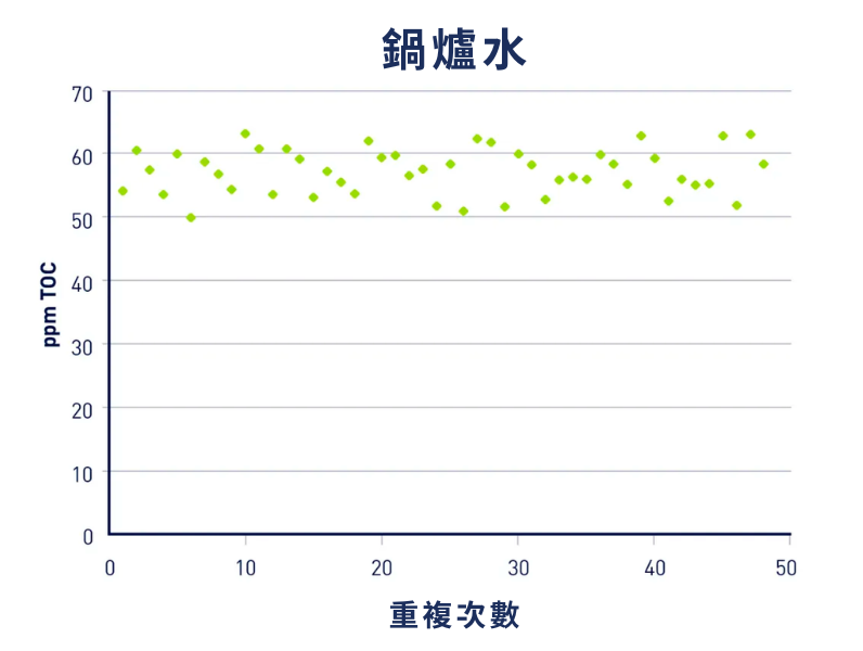 圖 2 顯示了在較長的一段時間內對鍋爐水的一個監測結果。在這個工廠裡,經理為 TOC 值設定了一個限值:80 ppm TOC,在監測的這段時間內 TOC 值一直低於限值。一旦 TOC 超過了規定值,操作員會快速報告情況並及時改進。