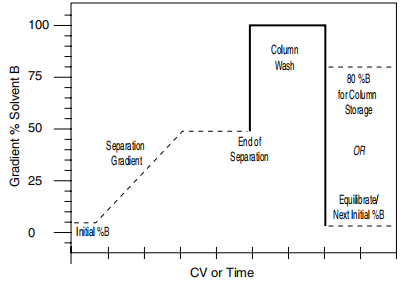 在適當的維護下,RediSep C18 色譜管柱可以使用三十次或更多。反相法應該編寫成在分離結束時,以 2-4 倍柱體積 (CV) 的高比例 (100%) 有機溶劑 (B溶劑) 沖洗管柱。經過 2-4 CV 的沖洗後,可以將有機溶劑的比例恢復到初始條件並沖洗 2-3 CV,以準備下一次運行的管柱平衡條件 (見 圖 1)。或者,有機溶劑的比例可以改為 80%,以便為色譜管儲存做準備。
